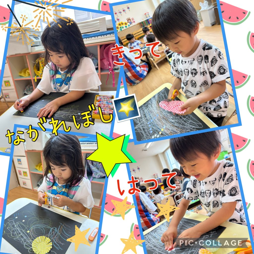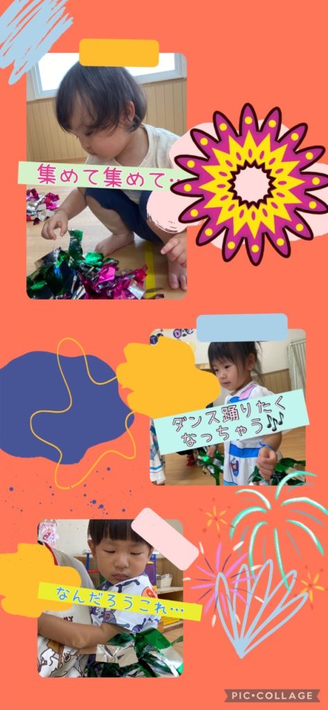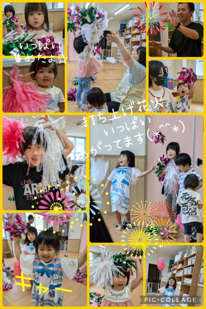 花火制作では、様々なカップを使って自分でどの材料を使うか考えて作りました😊大きい子は、ハサミで切り込みをいれて、重ねてみたり並べて飾ってみたり夢中で取り組んでいました❣️