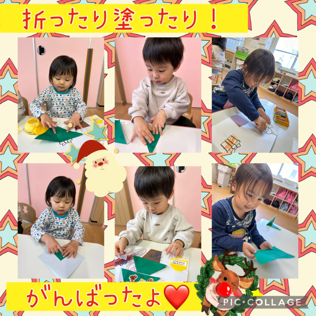 12月折り紙制作🌲 未分類 2024.12.11 12月といえばクリスマスですね❤️子どもたちも、サンタさんに会えるのを楽しみにしているようです😊✨✨ 『お家にツリー飾ってるんだよ!』『くつ下をぶら下げておくといいんだよね!』など嬉しそうにお話しをしながら折り紙制作を行いました。 小さい子は三角折りをしてツリーを作りました🌲大きい子は、クリスマスケーキを作りましたよ🍰角と角を合わせるのを意識しながら作りました😊玄関に飾りますのでみて下さいね❣️ 写真&文章→吉田