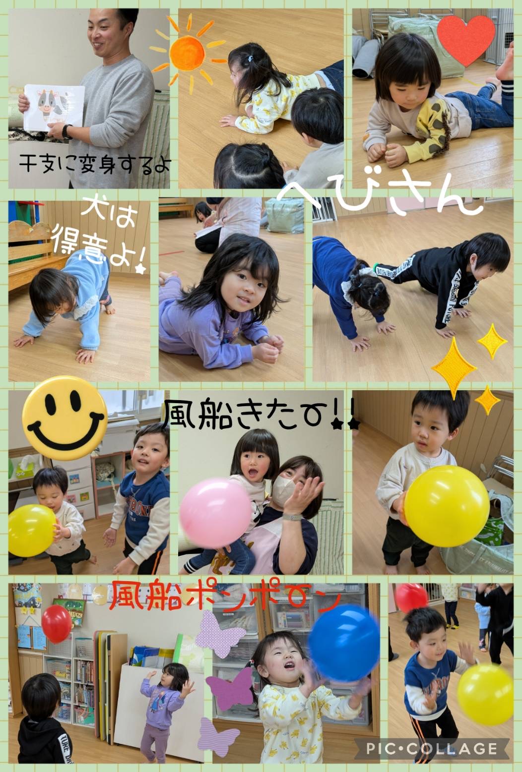 1月のひらめき実践塾✨ 未分類 2025.01.16 今日はひらめき実践塾のまこと先生が来てくれました! 『お正月』をテーマに遊びました😊 十二支の動物に変身し体を動かしました!自分のイメージした動きを自由にし、とっても楽しかったですよ🩷 羽子板のかわりに風船ラリーをしたり、コマ作りもしました! 写真→藤井&吉田 文章→吉田