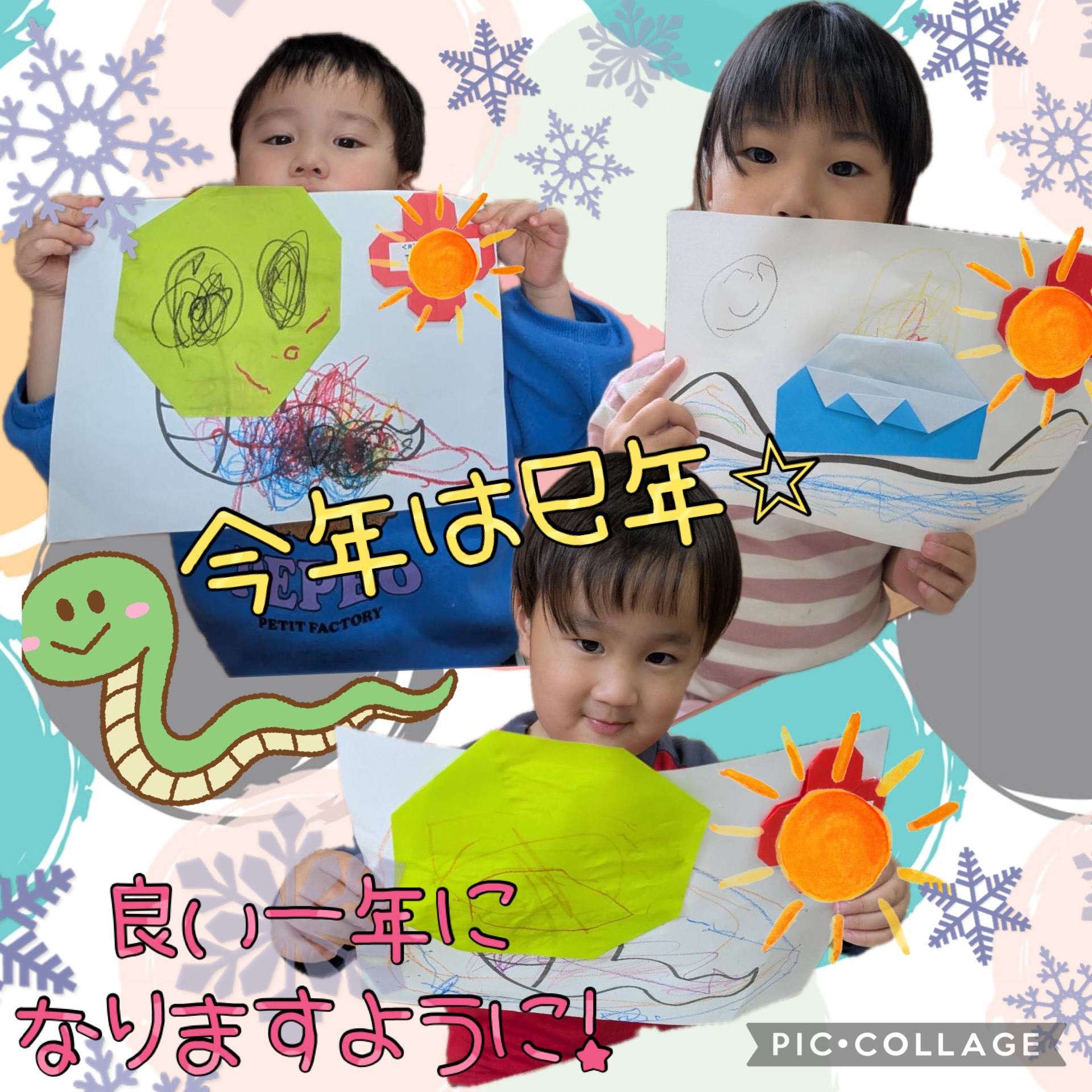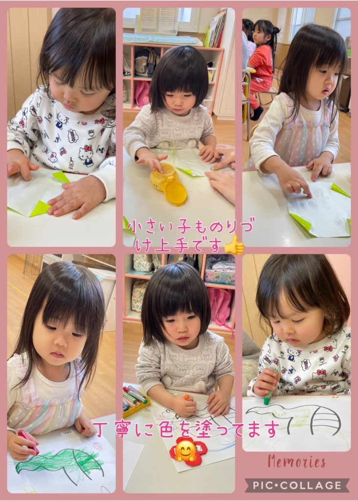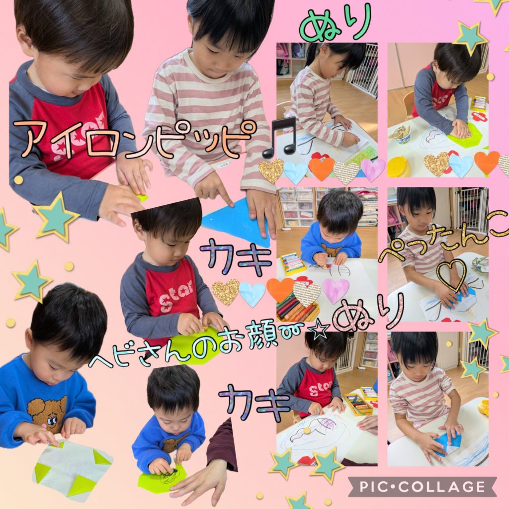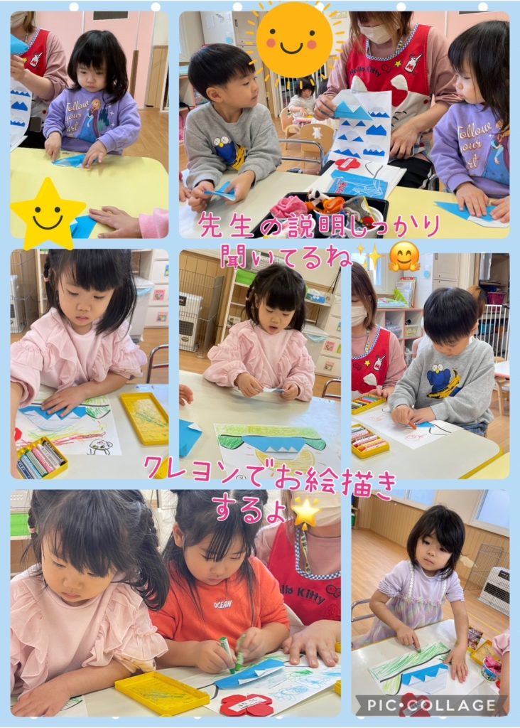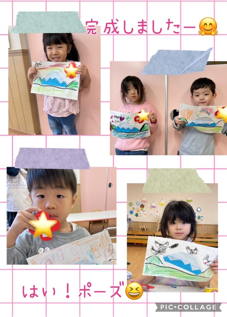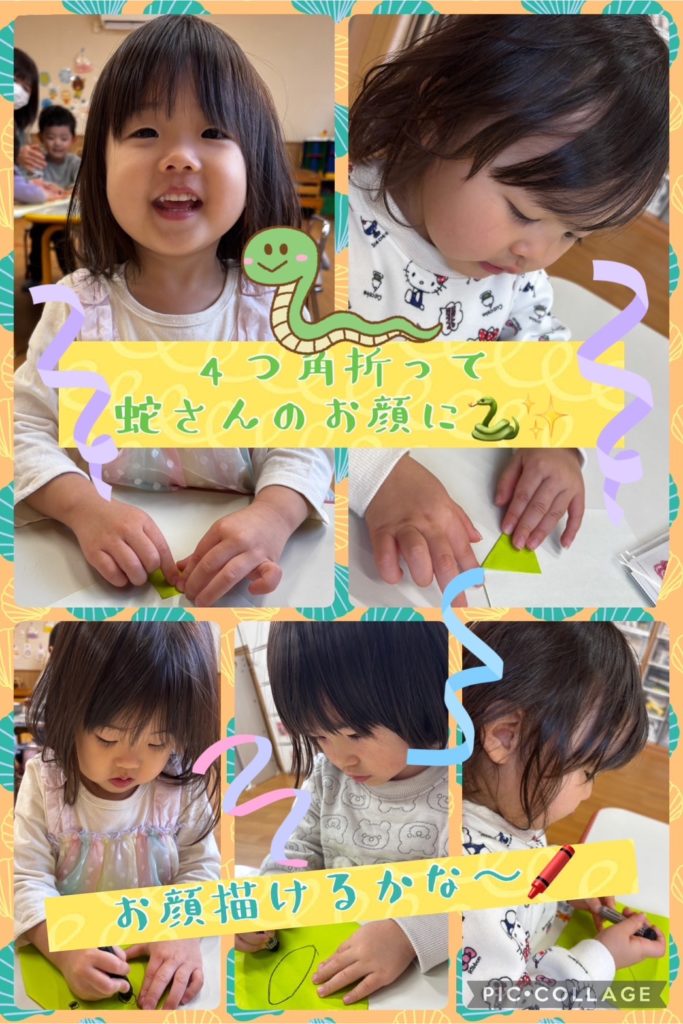 1月折り紙制作🗻🐍 未分類 2025.01.22 今月の折り紙制作は 今年の干支のヘビさんと🐍 お正月にちなんで富士山です🗻 以上児さんはお手本の折り方説明を見て自力ですすめようとする姿も見られるようになりました☺️ 今日のドットマーカーで遊んだ様子も載せておきますね🌼 写真構成🤳吉田・林・渡辺・山中 文章✏️山中